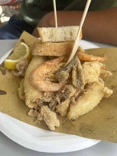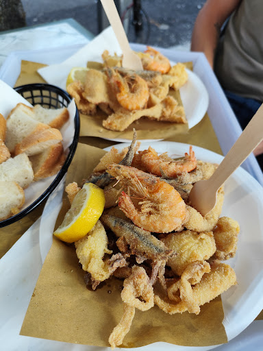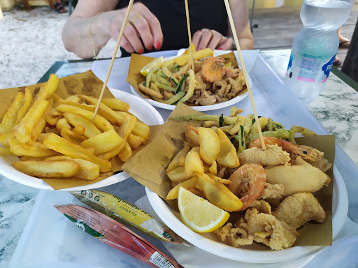 Read moreFriggitoria all'aperto (anche un paio di tavoli al coperto) che permette di consumare una croccante frittura anche a tarda sera (in estate fino alle 22.30/23), con servizio self e ambientazione stile sagra di paese. Il gran fritto misto (pesce e verdure) è davvero ben eseguito, croccante e "asciutto". Il problema è che, oltre a trattarsi di pesce chiaramente surgelato, non è affatto "misto": trattasi per lo più di soli totani e patate, con una sardina e un gambero di numero. In più qualche striscia di zucchina. La quantità è più che buona ma non giustifica il prezzo ben sopra la media (17 euro), considerando la mancanza di scampi e la carenza di gamberi, alici, etc. A un prezzo simile ci si aspetta una varietà superiore di pesce, zucchine e carote. E una quantità inferiore di patate. Servizio rapido, considerando l'orario e l'affluenza. Prezzo del pesce sopra la media, mentre i contorni (crocchette, mozzarelline, olive all'ascolana, etc.) e le bevande hanno prezzi nella media. Personale...