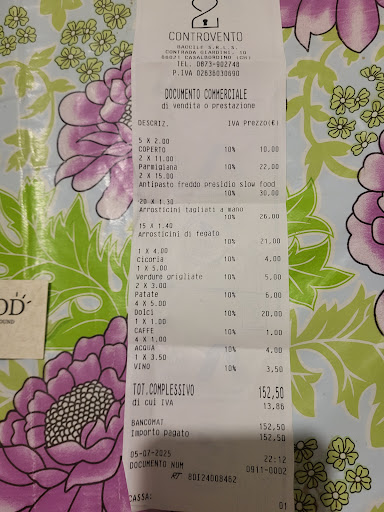 Cena di famiglia. Antipasto ventricina e pecorino + pallotte cacio e ovo. Salumi e formaggi di qualita e pallotte cucinate veramente bene. Per i primi abbiamo preso tutte e 3 le alternative disponibili; gnocchi crema di zucchine , fusilloni con sugo alla ricotta, pasta al sugo di ventricina, nessuno di essi ha entusiasmato . Secondo grigliata mista + arrosticini ; ottima la qualità e la cottura. Vino della casa cesasuolo; non buono. Servizio da rivedere, i 4 primi sono arrivati a coppia con intervallo di 5 minuti, durante il servizio si è rovesciata la brocchetta del vino, non è stato offerto di riportarne un altra. Posto tranquillo, abbiamo cenato all aperto non ho visto il locale all interno. Prezzo giusto. Per quanto speso avrei gradito un caffè offerto, poi vedendo i 40 centesimi del risultato della somma lasciato nel conto, credo non sia consuetudine offrire qualcosa...