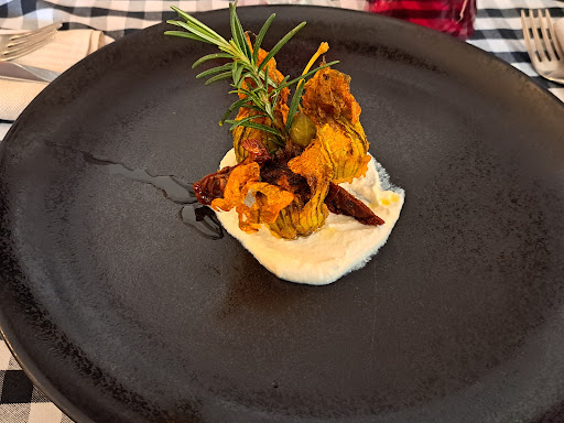 Arriva UN solo antipasto: fiori di zucchina ripieni. Dopo un quarto d'ora arriva il secondo. Un tagliere di specialità monferrine.