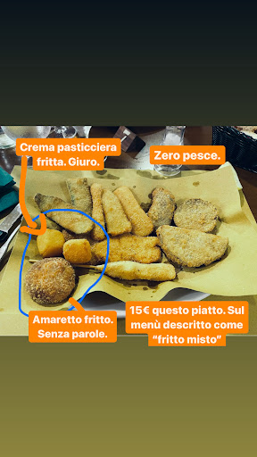 Read moreTerrificante. Il fritto misto a 15€ NON è un fritto misto di pesce. È una serie di verdure fritte con dentro anche: un AMARETTO FRITTO e due BOCCONI DI CREMA PASTICCERA FRITTI! Nel fritto misto! Senza nemmeno avvisare! Ma come diavolo è possibile? Nel fritto misto quindi c’era assolutamente ZERO PESCE. Un imbroglio totale.