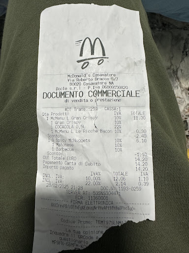 Read moreHo dato una stella solo perché non è possibile metterne zero. Andiamo con ordine: il cibo è a malapena passabile, se non fosse per il fatto che, soprattutto al drive, dimenticano spesso e volentieri di consegnarti alcune cose. L’episodio di oggi, 28/02/25: vado al drive e ordino. L’ordine viene preso correttamente, ma con evidente svogliatezza e fretta. Come al solito, dimenticano di aggiungere le patatine. Torno a reclamare e mi rivolgo a una dipendente (capelli lunghi ramati, raccolti in una coda) che, con aria scocciata e arrogante, mi risponde in modo sgarbato. Si confronta con una collega (capelli lunghi neri, legati in una coda, e labbra molto voluminose), e insieme mi accusano di dover restituire un’ipotetica porzione di patatine in più che, in realtà, non mi era mai stata data. Alla fine controllano la mia busta, ne rovesciano il contenuto e si rendono conto dell’errore. Tuttavia, invece di scusarsi, gettano le patatine nella busta in malo modo, facendole rovesciare nuovamente. Poi mi lanciano la busta tra le braccia e chiudono la finestra in faccia. Scrivo questa recensione dopo numerosi episodi simili, che ho sempre lasciato correre. Ma a quanto pare, la scortesia di alcuni dipendenti è una costante. Allego lo scontrino della serata, che, curiosamente, viene sempre strappato proprio nella parte in cui si trova il QR code per lasciare una recensione....