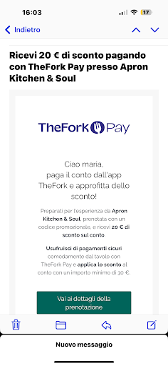 Read morePremesso che per me un ristorante da 50/60 per persona deve dare un Wi-Fi incluso devo riferire che non ho potuto pagare con app the fork ne usufruire dello sconto di 20 euro a me dovuto e questo è assurdo visto che loro aderiscono alla app ! Cibo servito freddo sia zuppa di cozze che carne e ho dovuto pagare anche 5,50 +iva perché non essendoci internet non potevo eliminare la persona mancante ! Ho avuto sconto di 5 eur per il cibo servito freddo Aggiungo che le sedute erano scomode sedute troppo basse rispetto altezza tavolo la carne era buona ma fredda la zuppa di cozze senza liquidò quindi non zuppa la sala tetra e triste! Ecco la prova dello sconto che avrei dovuto avere e voi aderite a the fork solo che fate in modo che le persone non ne possano usufruire e questo è scorretto ! Io l’ho fatto presente che avrei dovuto avere lo sconto ma non me lo avete applicato e non è per i 20 euro ma per principio . Tra l’altro mi avete fatto 5 euro di sconto ma io ho lasciato la mancia di 5 ma a parte questo servire piatti freddi e’ inaccettabile Comunque . Va bene pagare 50/60 per persone ma bisogna avere anche un...