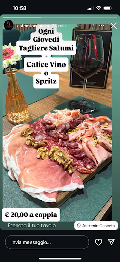 Read moreNella baraonda delle decine di locali della movida casertana, Astemio si distingue per il suo ambiente intimo e tranquillo: in un attimo ti ritrovi lontano dal caos con la possibilità di una serata di degustazione di taglieri ECCEZIONALI (!!!) di primissima qualità e ricchi di attenzione nella scelta di ogni prodotto in quanto a provenienza, gusto e preparazione. A dispetto del suo nome🤣 , Astemio propone una scelta di vini di altissimo livello che possono essere ancora più apprezzati in un ambiente che, al contrario di tutti i locali del centro ( in cui devi gridare per scambiare due chiacchiere) risulta tranquillo, accogliente e familiare. Da provare e da ritornarci... ancora e...