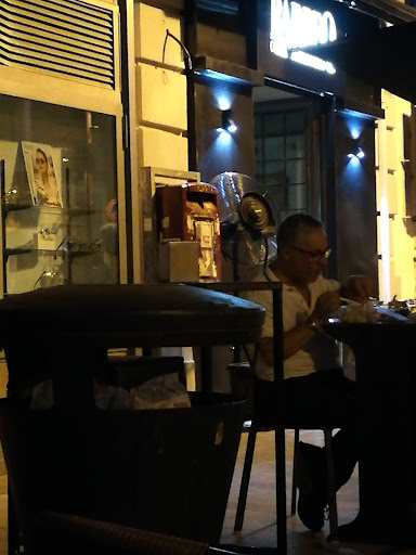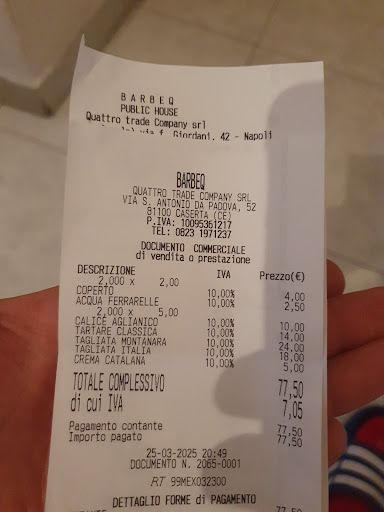 Read moreSarebbe decisamente meglio limitarsi al necessario quando il surplus non si è in condizioni di offrirlo. Come BBQ sicuramente improvvisati: chiedo un hamburger al piatto e mi viene servito in una vaschetta di plastica trasparente con posate in plastica. L'hamburger è all'aroma di pesce (deduco sia stato cotto sulla stessa piastra). Il calice di vino è segnato da diverse precedenti labbra (ma qui siamo alle basi). Non vengono serviti tovaglioli sui tavoli insieme alle portate né a noi né a nessuno degli altri utenti. Diverse delle portate dei diversi tavoli, noto, vengono servite sbagliate. The last but not the list gli scarti dei tavoli vengono gettati nel cestino pubblico della strada (corso Trieste)... Penso si possa...