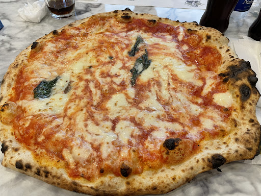 "The pizza is huge, there is a plate underneath it that is not visible, the pizza is lying on the table, and it's not very pleasant to eat from the table. Why can't plates be matched to the size? The watery sauce makes the pizza soggy and mushy, and after 5 minutes, you can only eat it with a spoon. On top, there are a few pieces of mozzarella; if you want enough to taste it and not just in the center, you have to pay extra for doppio mozzarella. No matter how you fold it, it just hangs in your hand like soaked toilet paper (tastes somewhat similar). In Caserta, there are about a dozen pizzerias making pizzas that da Michele can't even be compared to. I understand its popularity is due to mentions in a primitive book and an equally...