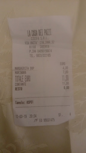 Abbiamo ordinato due pizze da asporto. Una marinara ed una Margherita. Totale 11 euro. Stupidamente al momento di pagare non abbiamo chiesto chiarimenti sul prezzo da rapina ma aspettavamo lo scontrino. E dopo aver preso i soldi il cassiere se ne esce con un "ok". Ovviamente chiedo lo scontrino dato che non ci era stato fatto e vediamo sullo scontrino, margherita 4 euro e marinara 7 euro!! Chiedo gentilmente al cassiere come mai una marinara da prezzo medio di max 3 euro sia passata a 7 euro e lui molto scostumatamente e con arroganza da mandarlo a raccogliere i pomodori risponde che io ho scelto la marinara che ci stanno le acciughe. Ovviamente non ci andremo mai più e tra amici e conoscenze faremo il nostro passaparola per questa pizzeria con prezzi spropositati. Ma alla fine volete sapere com'erano la marinara con oro grattugiato e la Margherita con mozzarella DOP presa direttamente dalle bufale sulla luna? La Margherita piccola, bruciata, triste e della mozzarella da vederla col binocolo. La famosa marinara con acciughe pescate a canna sul mar nero era con 3 (ma davvero tre di numero) acciughe e capperi spiaccicato sopra e bruciata da far schifo! La solita pizzeria casertana che può essere frequentata solo da casertani. Alla fine il cassiere (nonostante noi aver pagato ancora non sappiamo per cosa, abbiamo salutato e ringraziato) con la sua educazione da Oxford non ci ha né ringraziato e nemmeno salutato. Posto lo scontrino delle pizze da prezzi da oreficeria e gusto da pizza da autogrill (anche se autogrill fa prezzi migliori e pizze mangiabili). Ah sullo scontrino della Margherita il DOP ne abbiamo gustato...