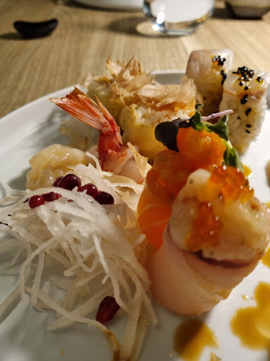 Read moreSul cibo, poco o nulla da dire: piatti gustosi e di bell'aspetto; solo alcune pietanze di cucina fusion non sono risultate equilibrate al palato. Quanto al servizio... La serata si apre con una scena fantozziana: la cameriera nel servire le portate lascia cadere sul tavolo una porzione (un roll nella fattispecie) di una pietanza destinata ad un altro tavolo; tralasciando cosa abbiano potuto pensare i destinatari della pietanza, solo dopo aver fatto notare alla ragazza, per il resto gentilissima, l'incidente occorso, è tornata a rimuovere il roll con una pezzuola, un po' goffamente tanto da intingerla, inaccortamente s'intende, nella salsa della tartare servita poco prima. Il collega, invece, dopo aver chiesto, senza aver concesso neppure il tempo per accomodarsi, se si gradisse acqua frizzante o naturale, per ben due volte, è tornato una terza essendosi dimenticato anche di come fosse stata scelta (frizzante); poi è passato una volta giusto per scoperchiare la vaporiera (?) e ha tolto più volte i piatti dal tavolo senza chiedere se avesse potuto, non essendovi peraltro problemi di spazio, mentre si aveva ancora la bocca piena. Quanto all'ambiente: nel complesso molto piacevole, ma soffermandosi inevitabilmente sui particolari emerge che: il divanetto è consunto con lacerti di simil-pelle svolazzanti, il tavolo sporco, la lampada da tavolo unta alla base, con lo stelo impolverato; bottiglie d'acqua servite altrettanto impolverate; ho dovuto chiedere di cambiare sia la forchetta che il piattino della salsa di soia perché sporchi (richieste, tuttavia, ottemperate con le massime celerità e cortesia). Altri particolari sono trascurabili. Questa esigenza di spiegare nel dettaglio è semplicemente volta a reclamare una mancanza di cura e attenzione, non coerenti in assoluto con il concetto di "experience". Tornerei perché il cibo è buono, con l'auspicio di trovare...