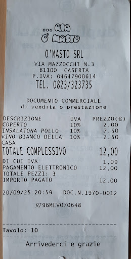 Cercavo un luogo dove cenare senza essere spennato, un luogo non turistico, una trattoria per residenti. Mentre ero a fare una spesina nella drogheria del Sig. Natale sulla vicina via principale (un grande, un signore, gli auguro di resistere con la sua splendida attività di vendita di alimentari), gli chiedo dove sarei potuto andare. Lui mi consiglia O' Masto. Lo raggiungo e sono accolto da Gerardo, omone che sembra non saper sorridere. Un modo di fare brusco che ti vien voglia di salutare e girarti sui tacchi. E avreste fatto MALISSIMO. Mi sono fermato per una superba insalatona di vitello, lattuga, rucola, olive nere e verdi, pomodorini. Un quarto di litro di fresco vino bianco locale. Aggiungiamo 2 euro di servizio (ormai in zona il coperto viaggia ovunque sui 2,50 euro, un FURTO a mio parere!) e mi ritrovo a pagare 12 euro (col POS, ho letto un altro messaggio dove si parlava di problemi). In genere, tutti i prezzi sono onesti e sotto la media. A due passi da una centralissima piazza di Caserta, ma fuori dalle "vasche" di camminamento. Un posto dove ci tornerei tutte le sere, se solo mi dovessi fermare di più in città. Bravi tutti!