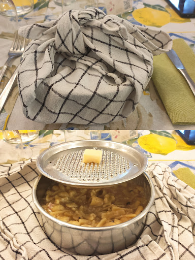 Non amo lasciare recensioni non lusinghiere ad un locale, ma essendo stata un'esperienza estremamente negativa stavolta lo ritengo necessario. Abbiamo prenotato in questo ristorante dietro consiglio del gestore del b&b in cui abbiamo alloggiato, circa un mese fa. La prima cosa che non ci è piaciuta, e che MAI ci era capitata altrove se non nel caso di piatti particolari, è stata l'impossibilità di ordinare due pietanze differenti, perché lo chef le cucinava minimo per due persone. Se lo avessimo saputo prima non avremmo mai prenotato in questo posto, visto che a quel punto mio marito è stato costretto ad adattarsi alla mia scelta, essendo io intollerante a diversi alimenti (per chi pensasse: "potevate scegliere delle pizze", le avevamo già mangiate a pranzo, per cena desideravamo proprio delle pietanze tipiche). Comunque, ordinato il "piatto unico per due" e una porzione di patatine per contorno, dopo un'attesa decisamente lunga arrivano i tegami coi primi e pensiamo finalmente di poter mangiare, quando mio marito si accorge di alcuni pezzettini che sembrano proprio essere di carne, alla quale sono intollerante e che quindi non mangio. Alquanto infastidita, lo faccio presente al cameriere, il quale, dicendomi che si è trattato di un' "iniziativa" dello chef (infatti sul menù non era riportata la presenza di carne fra gli ingredienti), si offre di farmi preparare un piatto diverso tipico della zona. Accetto, e dopo un'altra bella attesa arriva il mio piatto (quando ormai mio marito aveva finito da un pezzo il suo), che, devo essere sincera, era gradevole, ne conservo un buon ricordo. Purtroppo, lo stesso non si può dire del servizio, perché dopo aver finito restiamo coi piatti vuoti davanti per un tempo lunghissimo, coi camerieri che credo avessero visto chiaramente che avevamo terminato le nostre pietanze, ma non passavano assolutamente a sparecchiare. Aspettiamo ancora pazientemente, visto che avevamo ordinato anche le patatine, ma dato che non arriva nulla mio marito ad un certo punto si alza e va a chiedere se le suddette patatine siano in preparazione: assolutamente no, perché l'ordine non era neanche stato preso dal cameriere! Ritenendo di aver atteso ben oltre il dovuto (ore, per aver mangiato cosa? La bellezza di due primi!) e sentendoci anche presi in giro, a quel punto, stufi e ancora affamati, decidiamo di pagare e andarcene: in un caso simile io avrei offerto la cena a dei clienti palesemente insoddisfatti, ma ovviamente non è andata così, visto che l'unica cosa offerta è stata l'acqua (microfiltrata dal ristorante stesso). Aggiungo solo che, mentre noi attendevamo invano seduti al tavolo, accanto a noi gruppetti più numerosi arrivati dopo consumavano un'intera cena e se ne andavano prima dei sottoscritti, e che il locale non era assolutamente pieno, cosa che avrebbe parzialmente giustificato le lunghe attese, ma anzi era semivuoto. Ah, le famose patatine le ho poi prese da un'altra parte, sicuramente con più soddisfazione. Concludendo, non boccio la cucina perché quel poco che abbiamo mangiato era buono, ma sul resto c'è davvero da migliorare: i clienti non si trattano nel modo in cui siamo stati trattati noi.