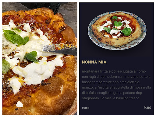 😭 NONNA MIA delusione per l'impasto che a me è arrivato croccante...in superficie e duro alla base tanto che tagliare col coltello era difficoltoso, non esagero, bisognava affondare il coltello e sfregare a mo'di sega, col rischio che qualche pezzo poteva finire sul tavolo. Ideale era "a'rutell" infatti con gentilezza la ragazza mi ha fatto tagliare la pizza in 4 con "al rutell". Ho chiesto al cameriere (venditore) se la pizza, almeno l'impasto, era lo stesso rispetto alla pizza ordinata e mi ha risposto di sì, quindi ho evidenziato che allora la foto era sbagliata e mi indicava che la foto era uguale alla pizza arrivata, "forse per un effetto di luce sembrava diversa 😂😂. Secondo vio la pizza arrivata è uguale alla pizza nel menù? . Dopo alcune mie precisazioni ha convenuto con me che la foto probabilmente è sbagliata, anche se io credo che la base è stata cotta male.