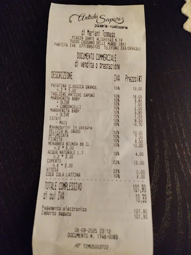 Read moreSiamo stati stasera per mangiare una pizza in famiglia con le nipotine... Abbiamo preso delle patatine e il tagliere antichi sapori fin qui tutto bene e buono . Al momento delle pizze è arrivata la pizza mia la fiorito che era salatissima poi in più a mia nipote sulla pizza baby dove la bambina voleva i funghi cardoncelli , i funghi erano crudi è amari perché erano vecchi... Veramente è stata una vera delusione perché sono state altre volte ed era tutto buono ma oggi una vera delusione come nei prezzi.. dove una aggiunta di un pugno di olive nere sulla pizza baby ti prendi una aggiunta di € 1,50 ..( che con un€ 1,20 compri tutto lo scatolo delle olive)🤦. Mi dispiace veramente tanto nn credo di ritornare ... Lo sconsiglio veramente. Il servizio era anche...
