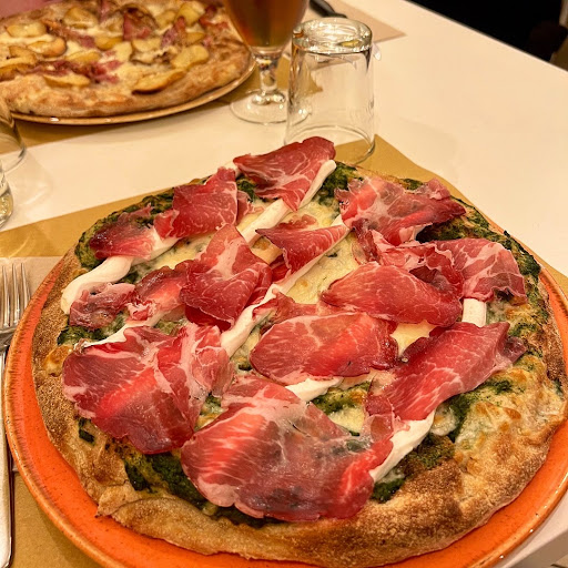 Sono stata in questa pizzeria ieri sera per un compleanno! Personalmente mi sono trovata molto bene! Eravamo in 10 persone e abbiamo preso 4 pale che ci hanno riempito, infatti qualche pezzo di pizza è avanzato. Ho assaggiato diversi gusti e mi sono piaciuti tutti: patate, guanciale e pecorino molto buona, zola e pere la mia preferita, quella al ragù mi ha sorpreso (sembrava di mangiare una vera lasagna), tonno e cipolle buona, il fuori menù con mortadella, stracciatella e pistacchio capolavoro e bella ricca come si vede dalla foto, infine speck, brie e funghi anch'essa buona. L'impasto della pizza è croccante e un po' difficile da tagliare e masticare (io lo preferisco più morbido ma va a gusti). Ho anche avuto la fortuna di mangiare tutti i pezzi centrali che penso siano migliori rispetto ai bordi. Do 4 stelle perché mi è stato riferito qualche difetto nella pala vegana che abbiamo preso. Preciso che è stato un fuori menù per il ristorante e che ci sono venuti incontro accettando la nostra richiesta. In generale le pizze vegane erano poco saporite (problema risolto per una persona con l'aggiunta di olio piccante) e in quella che doveva avere le verdure grigliate mi è stato riferito fossero crude. Ci hanno fatto anche il servizio torta al costo di 50 cent a testa aggiunti al coperto di 1,50€. La location è molto carina e suggestiva, con tutte le lucine sotto il porticato affacciato su un bel prato verde. Accanto vi sono anche una gelateria e un pub, comodo per continuare la serata....