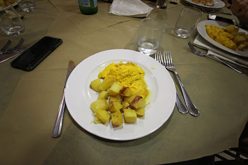 The main dish was the worst. The vegetarian variant consisted solely of potatoes and a fried egg, again looking very dull. The standard dish had chicken instead of a fried egg. Others told me that the chicken was too dry. The taste was okay, but being able to actually swallow your food is pretty essential. I first ate a bit of egg and as you can see in one of the pictures I added, it had way too much olive oil added to it. I'm pretty sure America would've started a war over it. After that, I tried a potato. Definitely not good. When you haven't even finished the first bite but already know you're not going to finish the plate, that's bad. Very undone on the inside and the outside was soaked in the olive oil - I made a quick run for the toilet because of the nasty taste the combination of oil and dryness left. I was done with the main course after that.