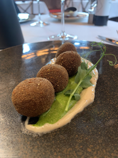 Il menù pranzo ha proposte di terra e mare. Ho scelto delle polpette di pesce su maio di acciuga e riduzione di rucola. Piatto molto ben presentato. Fritto leggerissimo e gusto ottimo (NE AVREI MANGIATE UNA TONNELLATA😂) Come primo piatto ho scelto il riso con asparagi e riduzione di nebbiolo e mandorle tostate. Semplicemente diVINO🤩 morbido e cremoso.