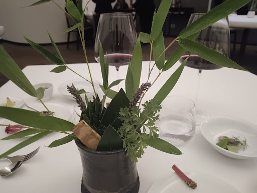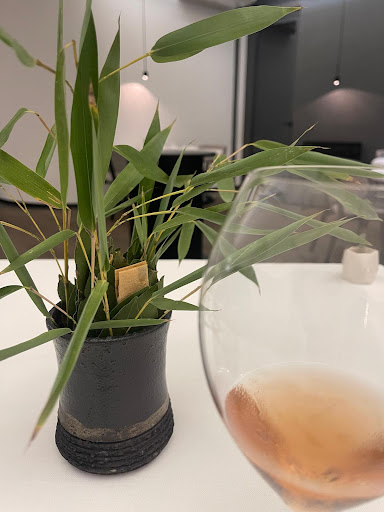 Abbiamo iniziato la serata con un aperitivo consigliato dalla casa: una bollicina rosé Trento DOC accompagnata da amuse-bouche sorprendenti, tra cui spicca il mantecato di pesce racchiuso tra due sottilissime cialde e nascosto in un vaso di foglie di alloro, un piccolo capolavoro di tecnica e creatività.