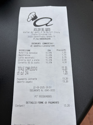 Read moreAtelier del Gusto è una vera perla nel cuore di Castelfranco Veneto. Ogni visita è un’esperienza sensoriale unica, grazie alla qualità eccellente dei prodotti e all’attenzione ai dettagli. La pasticceria offre dolci raffinati e curati in ogni aspetto, con ingredienti freschi e di prima scelta. Anche il caffè è ottimo, accompagnato sempre da un servizio cordiale e professionale.