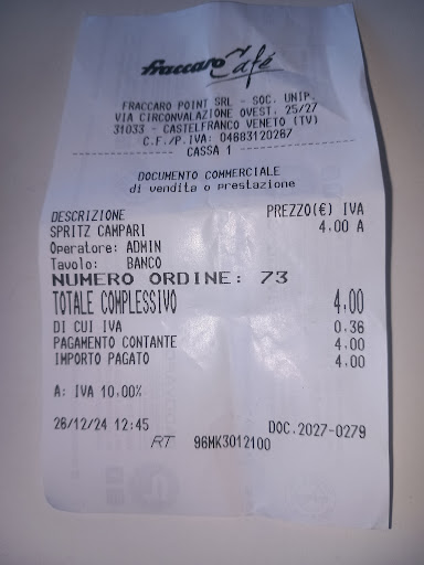Risposta dal proprietario 2 ore fa Buongiorno Antonio, Non tutti gli operatori sono abilitati alla cassa ma è difficile capirlo, la cassa è automatica, lo scontrino esce ma ci vuole qualche secondo e non serve sollecitarlo. Si aggiorni, in zona arriva a anche a 5 euro lo spritz, se poi scrive tutto questo poema per farci capire che non se lo può permettere, ci space. La prox volta ce lo faccia presente che glie lo offriamo noi, a Natale siamo tutti più buoni!!!