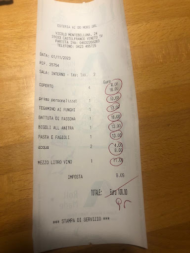 Abbiamo pagato 45 euro a persona per 1 antipasto e 1 primo. In 2 su 4 hanno ordinato un dolce e in 3 su 4 un caffè. Il tutto accompagnato da 1 litro di vino in caraffa, vino della casa. Decisamente troppi a mio parere per una osteria, ancor di più se vogliamo evidenziare il fatto che i prezzi presenti sul menù sono stati praticamente tutti maggiorati al momento del conto. Questo è il fatto più grave che mi ha fatto mettere 3 stelle. Capisco che magari gli aumenti delle bollette hanno richiesto un aumento dei prezzi per i gestori, ma questo andava segnalato per correttezza o direttamente nel menu (con un menu aggiornato) o, alternativamente anche a voce... Spiegando che c'era un supplemento di 1/2 euro circa rispetto al prezzo indicato nel listino. È una questione di rispetto nei confronti degli ospiti.