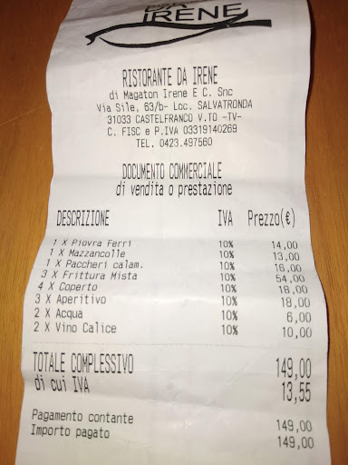 Sono tornato con un collega a mezzogiorno con prezzo fisso ora a 20 €, Non so che dire, con quello che propongono ora e veramente fuori prezzo. Per non parlare di quello da 25 €, propongono le stesse cose in locali da 13/15 € non sei da Irene ma per pranzo !! Ci sono tornato a cena, questa volta e stata una delusione, tolgo due ⭐⭐ Rispetto a tempo fa il locale aveva diversi tavoli liberi, di sabato sera, la dice lunga. Preso un antipasto di molluschi alla griglia, cozze di bassa qualità, all'interno erano molto piccole, cotte troppo, perciò gommose e senza sapore, le vongole, alcune troppo cotte, altre ancora crude, cenestrelli così così, capesante passabile, comunque tutto troppo unto. Linguine ai ricci di mare.... non so che dire, forse il sugo troppo cotto era marrone scuro, ma non si sentivano i ricci, solo olio e pezzettini di qualcosa. Aprezzata la catalana. Non ci e piaciuto il fatto che sei obbligato a prendere la bottiglia, senno ti versano loro due dita di vino e ti fanno pagare il calice ( un calice deve essere un calice e non un quarto di flute ) meglio la caraffa di sfuso e ognuno si serve come e quanto vuole. conto nella media....