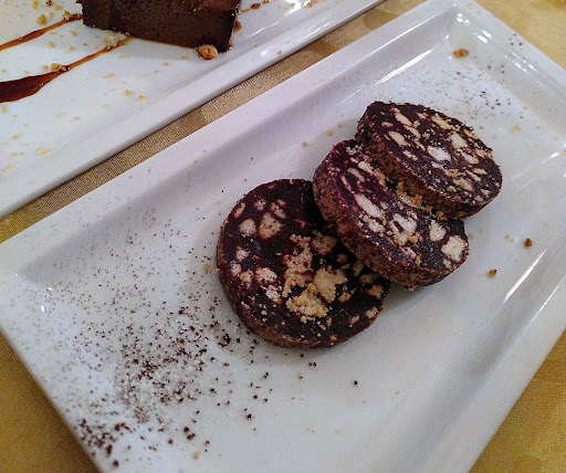 Anschließen gab es den ersten Teller (Primo Piatto). Dieser war für die meisten von uns nach der Vorspeise schon ausreichenden sättigend, sodass nur ich einen zweiten Teller (Secondo Piatto) nahm. Ich hatte Parmigiana di Melanzane, die wie bei meiner Oma geschmeckt hat. Ich kann as Gericht sehr empfehlen. Anschließen gab es für mich noch Kalbsbäcken, die ebenfalls sehr lecker und äußerst zart waren. Die anderen aßen Gnocchi und Nudeln, die ebenfalls köstlich waren. Zu unserem Essen tranken wir den Hauswein, den ich sehr empfehlen kann, wenn man trockenen und kräftigen Rotwein mag. Als dessert gab es für uns Tiramisu, Sorbet, Salame dolce und die Spezialität des Hauses. Alles davon war sehr gut. Ich selbst hatte die "süße Salami", Schokolade und Kekse in Salami Optik. Als Abschluss gab es Espressi und für mich ein Likör "amaro", das geschmacklich mit Jägermeister vergleichbar ist.