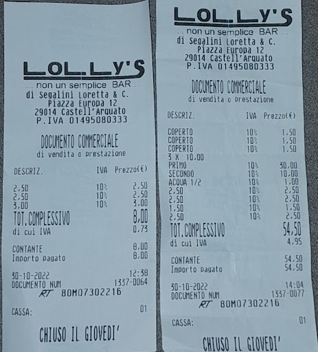 LOLLY' S non un semplice bar proprio come indicato sullo scontrino fiscale. Adesso vi voglio raccontare la mia esperienza. Durante la visita con amici a Castell'Arquato, ci siamo fermati in questo bar per un aperitivo. Dato che era da poco passato mezzogiorno, abbiamo chiesto al ragazzo se potevamo pranzare. Abbiamo ordinato tortelli alle erbette fatti in casa con burro fuso e salvia ( strabuoni ) ed un piatto di salumi misti piacentini. A fine pranzo, visto che eravamo gli ultimi clienti rimasti, la titolare nonché la cuoca, è uscita dalla cucina a scambiare quattro chiacchiere ed ha letto subito nei nostri occhi la soddisfazione di chi ha consumato un pranzetto coi baffi. Complimenti per l'ottima ospitalità e...