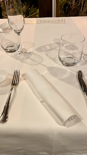 It is the same philosophy that has inspired today’s menu. The setting tables are located on the garden terrace, the light is remarkably soft with a candle on each table.