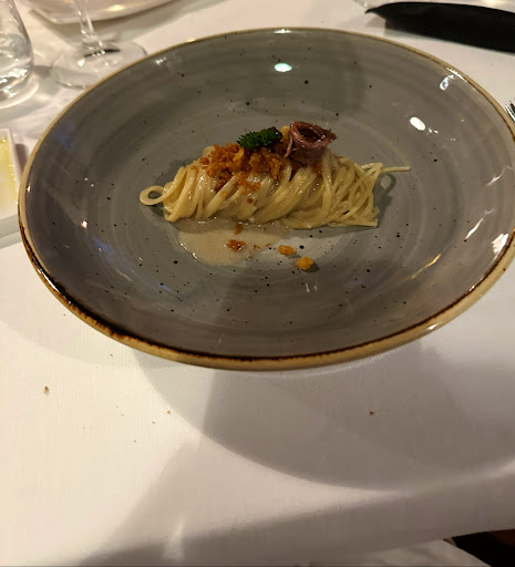Read moreUna bella location proprio all’estremo della baia di San Marco, ha fatto da contorno ad un’ottima cena a base di piatti che partendo dalle materie prime del territorio vengono poi presentati in veste moderna e gourmet, nella miglior accezione del termine. Il servizio è molto professionale e puntuale nella descrizione dei piatti e della loro composizione. Dopo una fantastica amuse-bouche di benvenuto composta da fico bianco cilentano e prosciutto crudo, abbiamo cominciato il nostro percorso con dei primi piatti. Io e la mia compagna abbiamo gustato un ottimo risotto a base di riso vialone nano, cacio e pepe di Sarawak e limone candito. Davvero ottimo l’equilibrio e l’eleganza del tutto con una marcia in più conferita dal limone candito. I miei figli hanno mangiato quelli che all’apparenza erano dei quadri visto l’impiattamento elegante degli stessi. Una genovese con ziti e agnello crudo/cotto per il piccolo, mentre il grande ha preso dei fagottini ripieni di melanzane, datterini gialli e rossi e crema di bufala. Proseguo poi con del tonno rosso scottato con fagioli cannellini su loro crema, completato da gel di cipolle in agrodolce. Anche questo piatto era sublime da ogni punto di vista: composizione, cottura, gusto, eleganza e impiattamento. Giudizio questo condiviso anche dal mio figlio grande. La mia compagna e il mio piccolo hanno optato per 2 antipasti come secondo piatto. Lei ha preso delle freschissime alici alla scapece, mentre lui un piatto davvero particolare che ho poi preso anche io al posto del dolce: una pizza in white, composta da pizza fritta su spuma di ricotta di bufala, tartare di gamberi rossi e caviale di salmone. La raffinatezza degli ingredienti, la loro delicatezza, la sontuosità e l’esplosione dei sapori rendono questa preparazione gustosissima. Forse come antipasto è fin troppo abbondante, ma al netto di questa considerazione ne avrei mangiate cinque! Chiusura per il resto della famiglia con dolci e piccola pasticceria, dopo un pre-dessert a base di gelato al cioccolato e fichi. La cena è stata accompagnata da una validissima bottiglia di Fiano cilentano in purezza delle Cantine Barone, una Vignonella 2021, presa da una carta che rappresenta molto bene questa terra...
