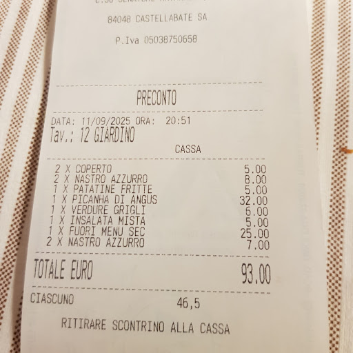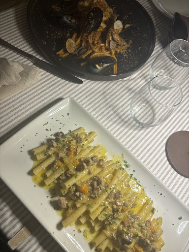 Premetto che siamo capitati in questo ristorante perchè diluviava ed è il primo in cui siamo riusciti a ripararci. Vista la pioggia abbiamo dovuto mangiare al chiuso, nella sala che probabilmente è quella dell’hotel e dove si mangia su tavoli e sedie da esterno. Il personale è gentile ma i tempi di attesa interminabili. Tralasciamo il tempo di attesa tra quando ci siamo seduti e il momento in cui sono venuti a prendere l’ordine, perchè giustamente erano indaffarati nel trasferire tutti all’interno. Quando ci hanno preso l’ordine più della metà della sala era già al primo o al secondo. Abbiamo aspettato 45 minuti per 1 antipasto da dividere in due e, nonostante il cameriere dopo 30 minuti di attesa per i primi ci avesse comunicato che erano quasi pronti, sono arrivati dopo quasi un ora, quando la sala era già praticamente vuota. Uno dei due primi ordinati è stato segnato sbagliato dal cameriere e non ci è stato comunicato, una volta chiesto chiarimenti ci hanno comunicato che l’avrebbero rifatto ma essendo comunque buono e per non sprecare cibo (oltre alla paura di ulteriore attesa), abbiamo rifiutato. Una volta alla cassa per rimediare all’errore ci hanno offerto degli amari che abbiamo rifiutato e ci hanno fatto uno sconto di 5€ sul conto, ma comunque il piatto sbagliato costava più di 5€ rispetto a quello ordinato da noi. Il cameriere è stato gentile e si è scusato moltissimo ma diciamo che ci saremmo aspettati un trattamento diverso visti i diversi disguidi. Comunque i piatti molto buoni anche se con prezzi alti (1 antipasto, 2 primi, 2 calici e...