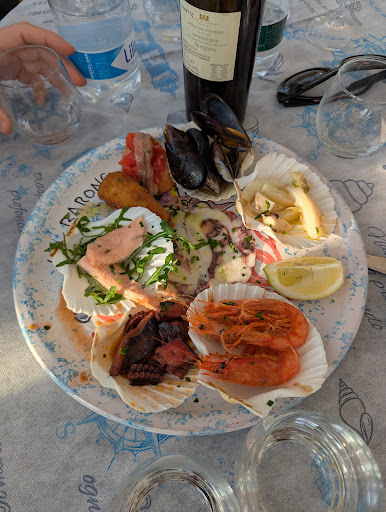 Ma non essendo i tipi di persona che si fanno scoraggiare dall'apparenza, ci siamo accomodati. Il proprietario è stato molto gentile, ci ha preparato subito il tavolo, dandoci quello con la vista migliore (peccato per la giornata nuvolosa, col sole deve essere uno spettacolo mangiare lí), e abbiamo ordinato. I piatti erano tutti a base di pesce, dagli antipasti ai secondi (quindi mi sento di sconsigliarlo per chi cerca carne).