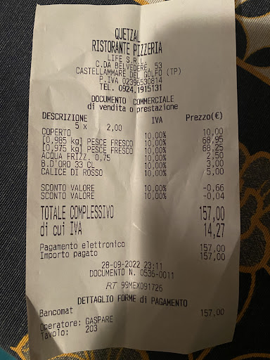The panoramic is amazing, location very strategic, hardly to find parking especially during peak season. Good attraction for tourist, if you looking for best scenery to represent Castellammare del golfo, fresh air, place for romantic dine out this is the place. My two star: Not being surrounding friendly for kids. There's so many angles around this restaurant contribute risk and danger for kids without attentive supervision from parents/adults. The hilly side, rocky type of soil might put your kids in evitable situation. I expect more warning sign or maybe build up fences as division and limit to No-enter area. Be very careful when you try to take some good looking photos. When I was there for some event booking, the owner quite rude and i felt offended for how they treating my family. The QR Code menu I found very troublesome, I'm aware we're in a modern world but things like special event and more discussion stuff they've asked me to be self-service myself, review the menu, choose whatever we like and save the date. That's it! Other staff talking with us whilst on phone conversation are no-manners at all. The food and the rest...for you guys to judge yourself. We not even have a chance to try them out as we were turned down by the property before...