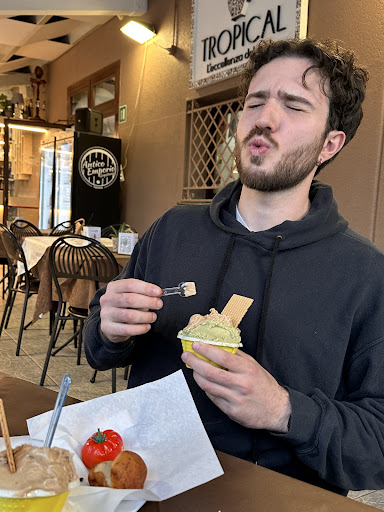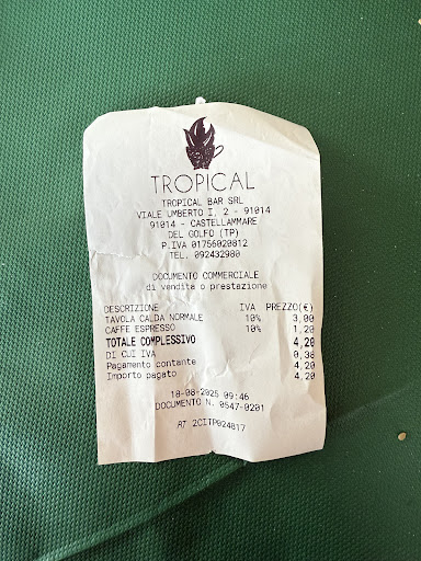 Read moreIl tropical è la mia sosta dal ritorno dallo splendido mare di Guidaloca. Che dire, partiamo dai gelati: da provare la pistacchiosa, gelato al pistacchio, granella di nocciole e crema di pistacchio ; nutella: il gelato fatto Nutella. Poi i classici nocciola e cioccolato ottimi. Gelsi, fantastico. Grande assortimento di torte, semifreddi e tronchetti gelato. Oltre ad essere scenografici, sono anche buonissimi. Ampio assortimento anche di dolci monoporzione, dalle cassatine alle paste di mandorla al tiramisù. C'è solo l'imbarazzo della scelta. Vogliamo poi parlare della tavola calda? Anche qui si soddisfano tutti i gusti, arancine al prosciutto e alla carne, calzoni fritti e a forno, sandwich di tutti i tipi, sformati di pasta a forno (anche annelletti, tipici siciliani) e molto altro. Provvisto anche di tabacchi e banco caffè classico. Bagno pulito, peccato che c'è ne sia uno soltanto per entrambi i generi. Consiglierei i doppi servizi. Per il resto lo...