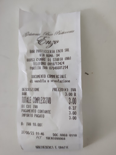 Read moreSe potessi darei 0, i ragazzi dietro al Bancone super gentili e veloci nel Servire , ma la proprietaria e presumibilmente la figlia che ha pesato i dolci freschi di una saccenza ed antipatia uniche , in primo luogo pesa i dolci su una bilancia senza che la Stessa riportasse il peso/euro dal nulla per due vassoio piccoli dei quali nemmeno sappiamo il Reale peso netto chiede 20€ senza rilasciare uno scontrino attestate nulla, da segnalare alla finanza , l’unica fortuna è quella di trovarsi al centro piazza senza una reale concorrenza altrimenti dovrebbero solo...