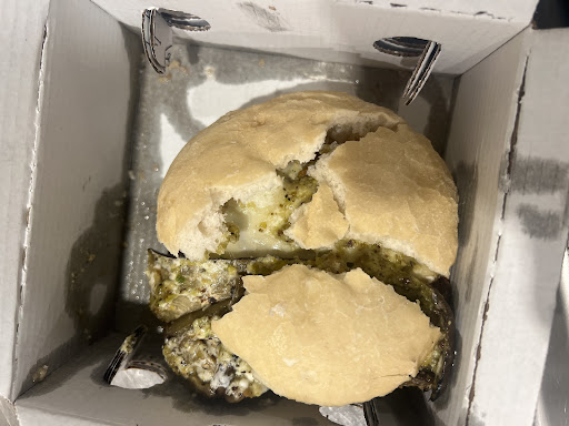 Purtroppo, la delusione è arrivata col panino da asporto. Una volta aperto, dopo nemmeno dieci minuti, mi sono trovato davanti un panino completamente spaccato, duro come una fresella per farvi capire: impresentabile. Panino surgelato e di pessima qualità, insapore e difficile da mordere. Anche il ripieno non ha aiutato: molto scarno. Mi aspettavo un panino ricco come la descrizione sul menù e gustoso , invece è stata un’esperienza povera sotto ogni punto di vista.