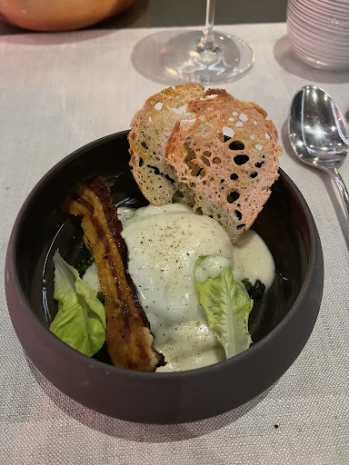 However, the food was mediocre. We started with a 64 degree egg and a strip a bacon, which was fine, but not memorable. The 2nd dish was spaghetti with a ragú sauce, which tasted and looked like something that was thrown together at the last minute. We then went into our 3rd dish, which was (again) pasta with (again) ground meat. To have two pasta dishes, both with ground meat, felt a little repetitive and thoughtless. The main course was a Parmesan crusted veal, which was tasty (my husband said some parts of his were chewy) but having just had three courses with meat, we were hoping for something else. The desserts were yummy - In fact, we loved the panna cotta.