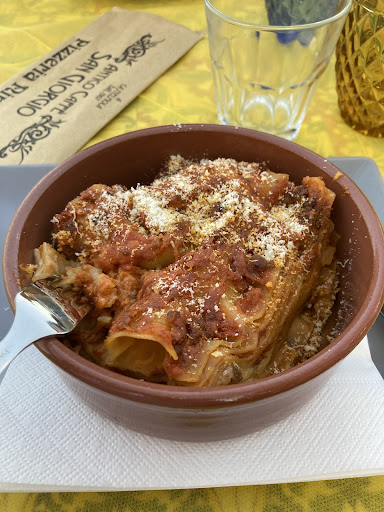 The atmosphere and service were good, apart from the waiters who originally tried to heard us into the restaurant whilst we were deciding, however the food and the value offered is sub par compared to other restaurants in the area. First, the prices were very expensive when compared to others, with my lasagna costing €14 and being very small. My lasagna was a bit cold and comprised of 12 layers of pasta and a small amount of meat and a minuscule amount of source, essentially a €14 block of pure carbs. Whilst it was still somewhat nice and was seasoned well I felt a shop bought lasagne would have left me feeling better and less bloated. Aswell as that my party also ordered a garlic and chilli pasta, this cost around €12-14 a bit pricy for garlic and past tbh, and the portion size was very small. Similar restaurants in the area offer a full on larger size of carbonara for the same price as this. However the pizza was very nice, and the dough was the best that we had on our trip. Also someone discovered tin foil piece in the lasagna, which was off putting, as the coldness and that made me think it was days old and warmed up. They also charge €3 for a small breakfast size of tropical juice - tasted like a bottle from a shop- especially bad value when for an extra euro a competing restaurant offered a larger glass of freshly squeezed orange juice. Overall, nice view and place for drinks and snacks, but way too expensive when compared to others . Just because it’s the first restaurant seen by tourists, doesn’t make...