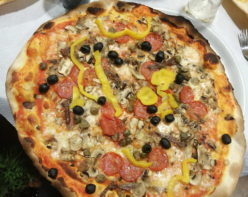 Zingara : pomodoro, mozzarella, salame piccante, funghi, alici, peperoni, olive nere e capperi. Giuliano : pomodoro, mozzarella, funghi, ciauscolo, cipolla stufata. Diavola e quattro stagioni : su nostra richiesta, la prima senza peperoni e la seconda senza cotto. A seguire : una meringata ricoperta di cioccolato e una pina gelata, un caffè normale, un deca, un orzo e un amaro del Capo.