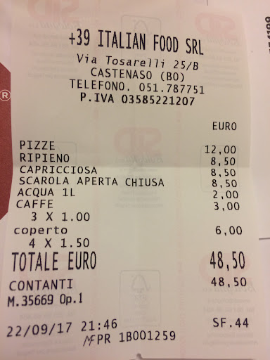 Ci sarebbe molto da dire di questo luogo ma perché parlare di chissà cosa quando alla fine quello che interessa davvero è se la pizza è buona??? Non sono di provenienza Campana quindi giustificato nel dare opinioni elogiando o non questo loro prodotto ma ho avuto modo di stare qualche tempo a Napoli (bellissima) e assaggiare di tutto tra cui la famigerata Pizza!! Che dire la Pizza da quelle parti è...è...e che ve lo dico a fare, fatta con le mani del Signore, da capogiro. Ora tornando al succo del discorso, siamo a Bologna a Castenaso, quindi ti aspetti una pizza del posto, cioè "buona" ma già sai che dovrai cancellare la memoria alle papille gustative altrimenti scatta la violenza...e allora?? Allora niente ti siedi ed ordini!! Poi nel menù leggi, cornicione ripieno alla ricotta...allora ridi perché sembra risuonare quel profumo partenopeo ma poi torni in te e accetti il cornicione con una bella pizza classica, mozzarella di bufala e pomodoro. Arriva il cameriere e nel piatto poco dopo ti porta questa sfida che non dovrebbe essere!! A prima vista, cavolo è proprio BELLA, proprio come...come quelle giù?? Bha...assaggiamo va!! Ora Signori io continuo a non voler/poter paragonare giù con su e nemmeno in questo caso potrei farlo però vi posso garantire che se in Campania la Pizza vale 10 e lode, in questo locale state tranquilli che non scenderete sotto il 9!! Pochi locali per Bologna hanno il mio rispetto su come fare la PIZZA e questo è uno di loro!! Al +39 la pizza potete andare a mangiarla senza ritrovarvi brutte sorprese e chi vi dirà grazie saranno proprio le vostre pupille gustative che con gioia sì gusteranno questo nostro...