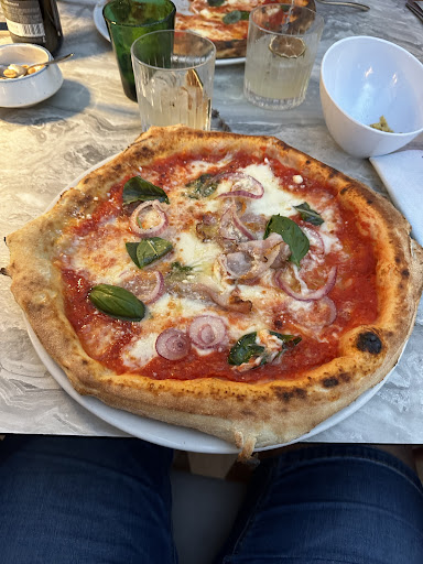 First, the good: The food quality was very high. Dishes were fresh, beautifully prepared, and full of flavor. Pizzas were amazing. Prices were fair for the quality and beachfront location. The restaurant itself is stylish and well-located on the main walkway of this charming coastal town. Making an online reservation was simple, the menu was available in English and listed allergens in each dish (nice!), and the wine and gin selections were impressive.