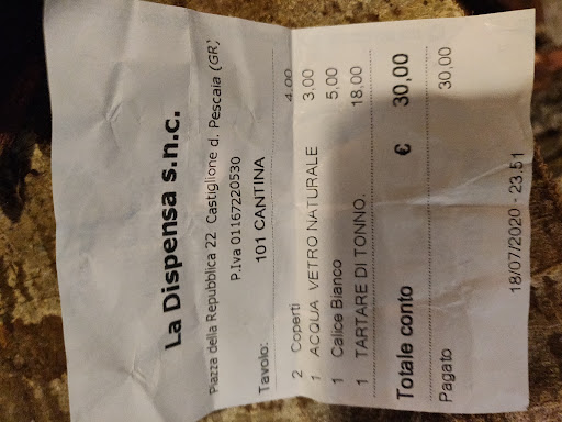 Pago il definitivo scontrino che allego (anche lì dopo aver perso altri 10/15 minuti) e vado a parlare con il titolare il quale mi dice che avrei dovuto già apprezzare che non mi abbiano fatto pagare i due primi piatti che ho ordinato e che non ho mangiato perché mi sono alzato...Roba da matti!!