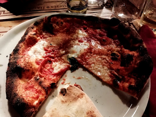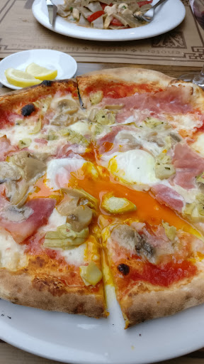 Read moreThe 🍕 capricciosa is tasty. I prefer a thinner, crispier crust, but the flavours are good. The pasta con spigola was also tasty, but not mind-blowing. Miniscule amount of wine. For €5 I expect at least more than 3 sips. Service is quick with everything.. except with ordering (???). After finishing my wine in 5 minutes, I unfortunately wasn't able to get a refill. Tip: don't wear light colored clothes when you sit outside. There are black coal flakes raining down from the chimney, possibly staining...