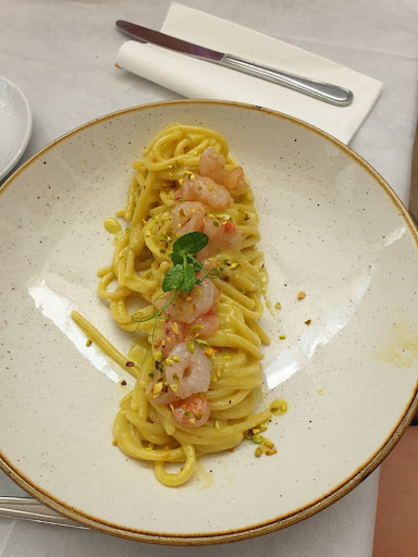 Abbiamo iniziato con l’antipasto “Fantasia dello chef”: un piatto variegato e interessante. Ottimi i gamberi freschi, gustose le polpettine e i panzerotti, originale la burrata affumicata accompagnata da tartare di gambero. L’unica nota meno convincente è stata una piccola porzione di cozze gratinate, risultata un po’ secca; tuttavia, il personale ha provveduto a sostituirla immediatamente, con grande cortesia, anche se avevamo precisato che non era necessario.