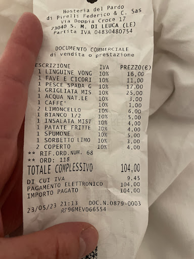 Read moreFantastic food and atmosphere combined with great service. I highly recommend you dine at Hostario del Parsi if you’re in S.M. di Leuca. Food was authentic and home made with several specials of the day. Our little Italian vocabulary was compensated by the staff who helped us through the menu and wine list in perfect English and provided us with some nice suggestions. Wish we had been 4 instead of just 2 so we could have tasted even more dishes from the menu.