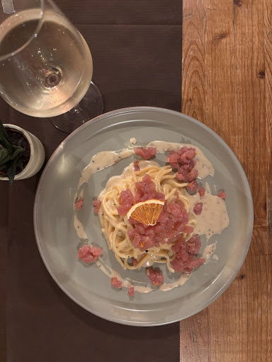 Era assolutamente perfetto! Ostriche freschissime e delicatamente condite, spolverate con il loro gin alle erbe (se vi piacciono), cozze con zenzero e zafferano e fave con cicoria, seguiti da pasta cacio e pepe di mare con tartare di gamberi di Gallipoli, poi gamberi di Gallipoli cucinati con sale marino grosso e olio d'oliva e polpo alla griglia con gazpacho come secondi. Tutto era incredibilmente delizioso! È stato il miglior pesce che abbia mangiato da molto tempo. Tutto è cucinato con amore e comprensione, partendo da ingredienti eccellenti. I proprietari hanno davvero creato un posto meraviglioso, all'altezza dei loro standard e della loro visione di una gastronomia fantastica e di una qualità dei prodotti senza compromessi. Abbiamo trascorso una serata indimenticabile in questa splendida osteria. Grazie mille per avercelo fatto...