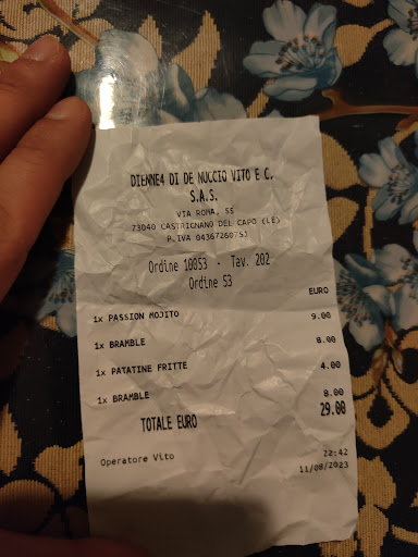 Posto TOP. Ci siamo capitari ieri per caso per un'aperitivo (veramente superlativo, ricco e vario ...giusto per idea uno spritz 5 euro...) e abbiamo trovato una splendida location dove si coniuga ottimo cibo, ambiente carino, personale attento e cordiale tutto a prezzi veramente incredibili. Elementi difficili da poter trovare insieme cosi oggi abbiamo deciso di tornarci per testare ulteriormente. Ampio parcheggio facilmente accessibile. Location molto romantica, elegante e informale, adatta per un aperitivo veloce o prolungato di ritorno dal mare o per mangiare qualcosa al posto dellla cena. Dispone di tavoli su vari livelli da dove si gode una bella vista del giardino e del mare. La cordialità e l'attenzione posta al cliente dal personale, come il loro orgoglio e passione nel proporti i piatti del menù tutti salentini, ti fanno capire che sei nel posto giusto. Propongono tutte pietanze tipiche di mare e di terra cucinate in maniera "casalinga" una più deliziosa dell'altra. Il barman con sapiente bravura prepara cocktail di ogni tipo veramente buoni (non la classica roba annacquata). La musica di sottofondo, ricercata, tutta di ottimo livello fa da cornice a questa atmosfera romantica che si crea. Ha una splendida carta di vini tutti locali a prezzi veramente onesti, con un ricarico veramente esiguo. Abbiamo.preso due pucce guarnite, un piatto di insalata di polpo, (piatti abbondandi e buoni) una bottiglia di spumante, un dolce ..costo 41 euro. Che dirvi di più. Se siete in zona non mancate di...