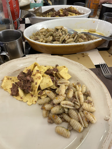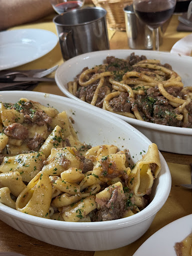 Read moreCi rechiamo oggi presso l’hostaria del cinghiale spinti dall’immensa pubblicità sui social che fanno apparire il locale quello che in realtà non è. Ci presentiamo in 5 più una bimba di 3 anni. Il gestore si siede al tavolo con noi per consigliarci di prendere appunto uno dei 3 menù a scelta che però siano uguali per non rischiare che uno arrivi prima…uno arrivi dopo eccetera…Scegliamo il menù primi quindi che recitava “antipasto della casa, bis di primi caffè acqua e coperto” chiediamo al titolare quindi secondo lui quante paste avremmo dovuto ordinare e lui afferma “circa 3 pirofile perché sono grosse” prendiamo anche il menù bimbi per la bambina a 15€ composto da primo e acqua. Arriva la cameriera a prendere l’ordine e ci dice che possiamo ordinare solo due primi e di prendere gli altri due a parte. Verranno presi quindi a parte 1 lasagna 16€ e 1 pizzocchero 16€. Passano 33 minuti per ricevere il famoso antipasto che comprendeva solo 1 tagliere con del pane carasau 4 fette di ogni salume, una ciotolina microscopica di cipolle e un altra ciotolina rosa. Siamo rimasti Increduli per la quantità misera dell’antipasto per 5 di cui ci tengo a specificare una fetta di affettato a testa. Il bello è che non finisce qui, dopo altri 35 minuti arrivano i primi, due pirofile di pasta che bastavano forse per 3 persone di cui allegherò anche le foto. Nelle foto vedrete la porzione che è spettata a me e a tutti gli altri. Una cosa vergognosa. 30€ di menù per non mangiare niente. 30€ a cui si aggiungeranno un dolce microscopico una coca zero e si arriverà facilmente ai 45€ a testa. Nel frattempo viene liberato un cane (Amstaff chiamato Black) che girerà sotto ai tavoli liberamente dovendo quindi stare attenti alla bambina che non faccia qualche sciocchezza insomma. Situazione con un po’ di ansia ogni tanto insomma. Ma non è questo il problema. Il problema è che abbiamo pagato 216,50€ per alzarci con la fame. Bastava veramente poco. Abbiamo chiesto di assaggiare la lasagna e i pizzoccheri, bastava portare un altra fiamminga di pasta o un antipasto un po’ più importante. Non discuto la qualità della cucina (migliorabile in quanto tutto molto privo di sale) discuto come si viene trattati, con sufficienza e braccino corto. Peccato che poi i soldi in cassa li vogliono fino all’ultimo centesimo. Inoltre questa recensione è di un ristoratore esperto quindi del settore e ogni singola parola non è stata amplificata o altro....