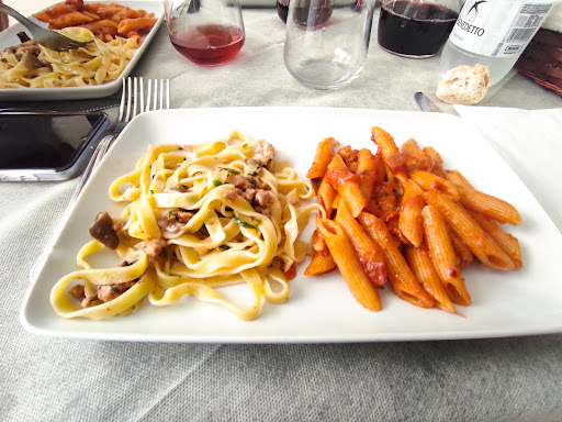 Ci siamo fermati in questo ristorante di ritorno dalle vacanze, previa prenotazione. Ordiniamo : spaghetti al pomodoro e tagliatelle con funghi porcini , grana e rucola, una scaloppina al limone e una cotoletta, con patate al forno come contorno. Il cameriere ci porta spaghetti al pomodoro e tagliatelle con funghi trilofolati e radicchio. Facciamo notare al cameriere che non era ciò che avevamo ordinato e chiede in cucina, dice che non c’erano né i funghi porcini né la rucola che era andata a male poiché ieri erano chiusi. Essendo già le 14 e in viaggio da 5 ore decido di scartare il radicchio e i funghi e per fame mangio un po’ delle tagliatelle. Ci portano i secondi ed erano buoni, le patate invece non erano al forno, ma tipo passate in padella e le Porzioni assolutamente non come le tante recensioni positive. Il conto 45€ con 1 acqua e 1 Coca-Cola. Primo sbagliato pagato per intero senza neanche le scuse della proprietaria. Insomma molto deludente, mai vista una cosa del genere, soprattutto perché c’eravamo solo noi, avrebbero potuto informarci al telefono o che magari non c’era tutto sul menu o anche al momento dell’ordine, avremmo gradito che ci venisse indicato che non era possibile fare il piatto scelto, non che viene servito un piatto totalmente diverso senza chiedere neanche, anche in caso di allergie...