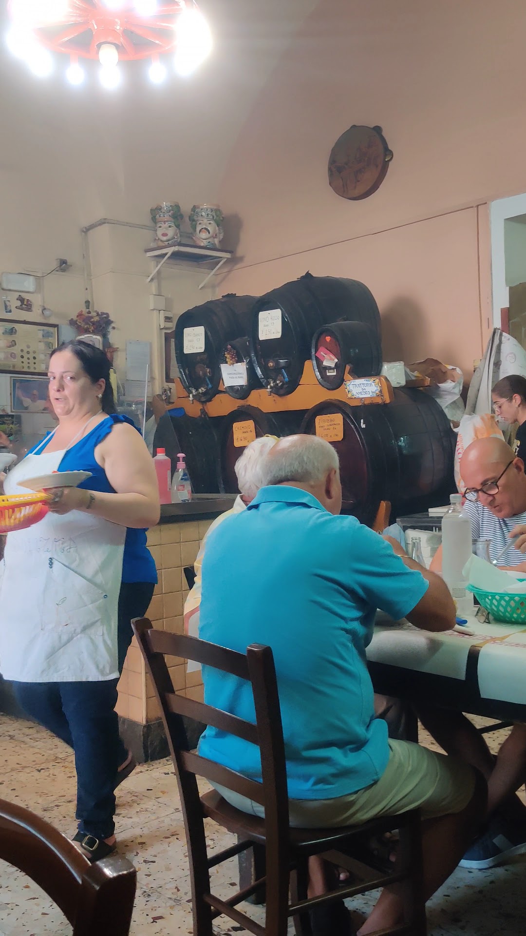 Read moreA rustic traditional eating place... Not a restaurant more a canteen type bar and dining area Serving local homemade food to the locals There's no menu just what they cook each day Meals are 10 euros each We had a plate of antipasti and a Soup a Pasta alla Norma and 3 mains with a small carafe of the house wine from a big vat and waters The soup was a tasty lentils and vegs We had Rabbit stew Grilled squid and Anchovies Breaded escalope of veal All delicious Friendly family serving the server spoke good English The place is packed with local workers Good atmosphere Limited streetside parking in a very local area off Via della Concordia Budget...