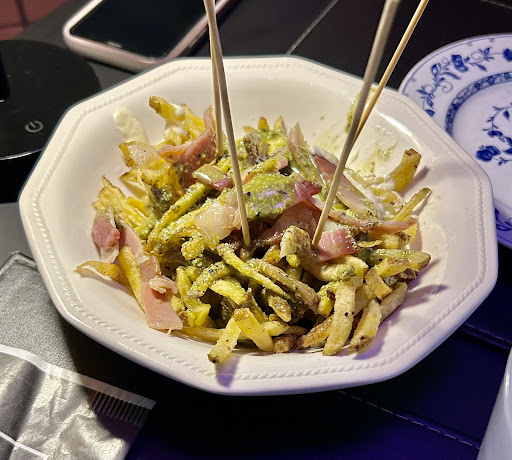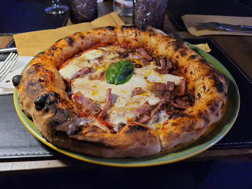 Posto veramente molto bello, il locale è curato, tavoli e sedie di design e comode. Il servizio non è male, ma abbiamo dovuto ricordare di portarci le birre per 3 volte, penso fosse dovuto alla confusione della giornata. Scarse le patatine, il sapore era buono, ma erano molle, per niente croccanti, si capiva che rano patata fresche, quindi più buone di quelle surgelate, ma andavano fritte meglio e messe sulla carta assorbente, non sul piatto. La pizza era veramente buona, una napoletana contemporanea con il cornicione bello alto, ma cotta bene, cosa rara, la napoletana la fanno quasi sempre mezza cruda. Unico difetto, un impasto non alveolatissimo, quindi un po' pesante, anche se digeribile. Molto buono anche il condimento della mia Sant'Angelo, si sentiva che i condimento erano di qualità, avrei però messo un po' meno salame, nonostante sia l'ingrediente che da il nome alla pizza, perché risulta un po' troppo saporita, e superata la metà, inizia ad essere troppo pesante, si riesce a rimediare mangiando sempre un pezzo o cornicione insieme alla parte con il condimento. Molto più buona la combo di Margherita, con sugo di pomodoro giallo, e pomodoro disidratato in polvere, una pizza più leggera, che non stanca. Ottimi anche i dolci, fatti da chocofusion, quindi si va sul sicuro, che però soffrono dello stesso problema delle pizze elaborate, il mio "cocco fiocco", al cioccolato bianco, fondente e cocco, risulta difficile da mangiare una volta superata la metà della fetta, da noi si dice che "sdinca", colpa probabilmente del cioccolato non ben bilanciato e del troppo zucchero, meno pesante il dolce al pistacchio della mia ragazza, che però non aveva un gusto di pistacchio bello forte ed era anche questo un po' troppo dolce. Conto abbastanza giusto considerando la qualità degli ingredienti e la cura della location. Rispetto delle norme covid da aparte dei dipendenti, muniti di mascherina, controllo de green pass all'entrata, ma poi la persona in cassa stava senza mascherina, quindi da questo punto di vista, non...