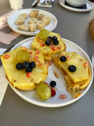 The waitress then gave in and offered us alternative fruits which we were more than happy about: strawberries, bananas and peaches. Only a minute later she came back to tell us strawberries weren't available anymore. We told her peaches and bananas would also be fine. Shortly after that a different waitress just put a plate with some bananas on our table, no words being said, no eye contact. We waited for the peaches but they never came. We then had to remove the pineapple by ourselves from the pancakes as well as pick up the bananas from the separate plate.