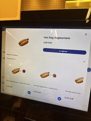 Read moreSono stato attirato dalla pubblicità ben visibile all’interno del negozio IKEA, che prometteva un hot dog vegetariano con cipolla croccante, cavolo rosso e altre salse al prezzo di 1,00€. Giunto al ristorante, ho effettuato l’ordine di diversi hot dog, sicuro che sarebbero stati serviti come promesso. Tuttavia, con mio grande stupore, mi sono stati consegnati tutti senza cipolla croccante e cavolo rosso. Chiedendo chiarimenti, mi è stato detto che per avere questi condimenti, avrei dovuto aggiungerli al momento dell’acquisto nelle casse self-service, pagando un supplemento.